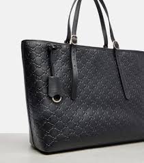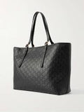 This large tote represents the perfect intersection of minimalist design and premium texture. The sleek black leather is elevated by an intricate embossed pattern, creating a sophisticated monochromatic look that is highlighted by radiant light gold-toned hardware. Its vertical silhouette and adjustable strap make it an ideal choice for the modern professional or anyone seeking a stylish, high-capacity daily bag.